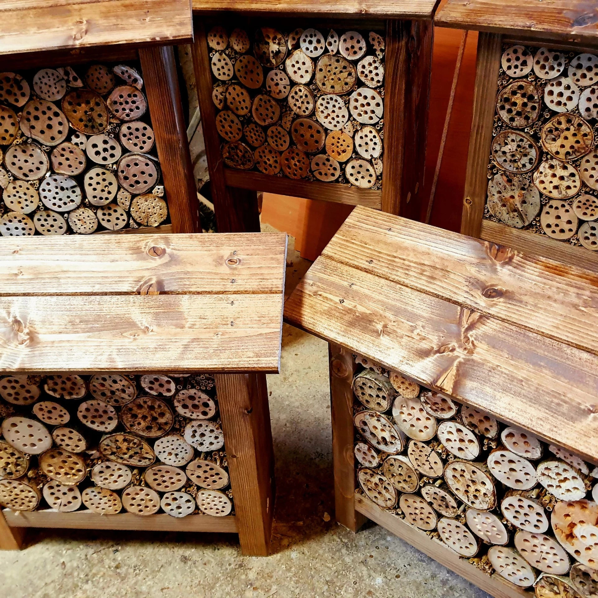 Vyrábíme hmyzí hotely pro samotářské včely přesně podle technologických parametrů určených Českou společností entomologickou. Pro výrobu hmyzích hotelů využíváme suché dřevo v rozdělení tvrdého a měkkého dřeva a vrtáme různé průměry děr přesné hloubky pro potřeby včel. Vyplňujeme rákosem. Rámy vyrábíme ze smrkového dřeva a natíráme ekologicky nezávadnými barvami.