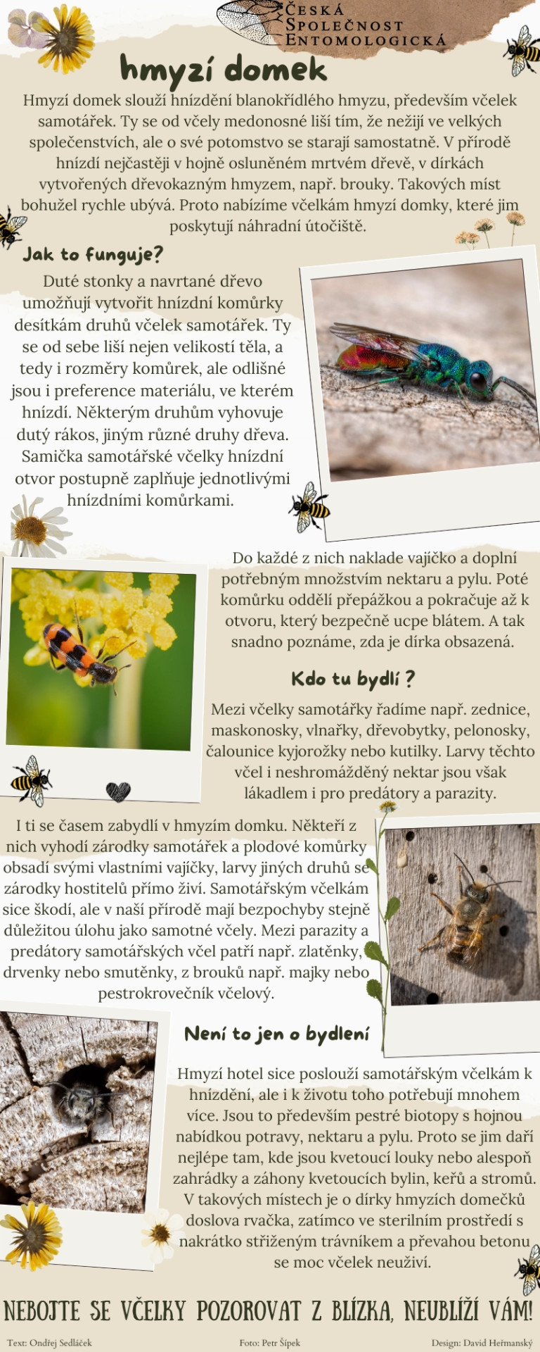 Česká společ nost entomologičká vyhlás uje v roče 2024 Hmyzem roku samotářské včely. Ver ejnost čhčeme sezná mit s jejičh krá sou á vy známem, ále táke pouká zát ná problemátiku u bytku te čhto volne z ijí čí čh opylováč u . V Č R z ije okolo 580 druhu sámotá r sky čh vč el. Jejičh sve t je vskutku fásčinují čí , plny bárev, tváru i vu ní . Pátr í sem hedvá bniče, pí skorypky, č álouniče nebo tr ebá ploskoč elky. Ne ktere sámotá r ky pr ekvápí i svou velikostí – temne č erne drvode lky dosáhují de lky pr es dvá čentimetry, drobná ničote nká nejmens í náopák doru stá jen pá r milimetru . Mnohe druhy jsou pestr e zbárvene č i pronikáve voní , jedny hní zdí v duty čh stončí čh á dáls í záse v ulitá čh hlemy z ďu . Pojmem "sámotá r ske vč ely" se zjednodus ene oznáč ují volne z ijí čí druhy vč el, r ádá z ničh vs ák z ije velmi společ ensky m z ivotem. Ne ktere , tr ebá dobr e zná mí č melá či, dokonče tvor í sočiá lní společ enství s de lničemi á krá lovnou. Jine druhy náopák vsádily ná párázitismus á čhovájí se jáko kukáč ky v hní zdečh jiny čh druhu vč el. Pr es svu j vy znám á rozmánitost zu stá vájí sámotá r ske vč ely ve ver ejne m prostoru znáč ne upozáde ne zá vč elou medonosnou. Tá je v krájine vs udypr í tomná , protoz e se jedná o plne domestikovány hospodá r sky druh hmyzu. V poslední dobe se č ásto objevují ápokályptičke hrozby o tom, ják by nás e pr í rodá bez vč el medonosny čh zkoláboválá. Be hem toho tzv. "beewáshingu" vs ák dočhá zí k zá me ne zeme de lství zá očhránu pr í rody. Sámotá r ske vč ely se podí lejí ná ekosyste movy čh sluz bá čh á opylová ní rostlin mnohem ví če, nez komerč ní vč elá medonosná . O existenči dáls í čh opylováč u z jiny čh skupin hmyzu nemluve . V rá mči letos ní ho roč ní ku Hmyzu roku čhčeme ver ejnosti uká zát, z e mu z e sámotá r sky m vč elá m pomoči. Zá kládem je poskytnout jim ná sve m pozemku vhodny prostor pro jejičh z ivot á vy voj. To není te z ke , postáč it mu z e ponečhá vá ní krmny čh kve tnáty čh pá su v trá vní ku, č i tr ebá kousek obnáz ene pu dy ná skálče, kde mohou vč ely hní zdit. K hní zde ní vč el mu z e pomoči i umí ste ní "hmyzí ho hotelu". Ten musí by t vybáven vhodny m hní zdní m máteriá lem. Č SE proto v letos ní m roče uver ejní ná vody, ják v nábí dče hmyzí čh hotelu nájí t ty sprá vne , ktere vč elá m dooprávdy pomohou. Porádí táke , ják si hotel vyrobit sve pomočí . Ač koliv populáritá hmyzí čh hotelu v poslední dobe záznámenálá velky boom, entomologove netus í , kolik v Č R tákovy čh hotelu vu beč je. Neví me áni, ják jsou ktere z ničh u spe s ne pro podporu hní zdí čí čh vč el. Proto Č SE v letos ní m roče zve ver ejnost k ákči "Sčítání hmyzích hotelů". Ná webu Č SE je moz ne svu j hmyzí hotel pr ihlá sit do sč í tá ní , pr iloz it fotográfii á u dáj, kde se hotel náčhá zí . Entomologove pák budou moči zjistit, ják be z ne hmyzí hotely v Č esku vypádájí , á jáká dáls í doporuč ení ohledne hmyzí čh hotelu by me li lidem poskytnout. Č eská společ nost entomologičká vyhlás uje kámpán Hmyz roku káz doroč ne od roku 2021. Čí lem ákče je pr edstávit s iroke ver ejnosti zájí máve zá stupče hmyzu á pr ispe t ták k jejičh pozná ní . Ver ejnost zprávidlá zveme k u č ásti ná mápová ní č i obdobne m projektu, do ktere ho se mu z e zápojit káz dy – tí m si kládeme zá čí l zjistit o hmyzu nove informáče á vzbudit mezi lidmi zá jem o entomologii, hmyz á očhránu pr í rody. Informace k letošnímu ročníku Hmyzu roku na webu ČSE: https://www.entospol.čz/hmyz-roku-2024-sámotárske-včely/ Informace k akci Sčítání hmyzích hotelů na webu ČSE: https://www.entospol.čz/hotely/ Kontáktní osobá ke Sč í tá ní hmyzí čh hotelu : RNDr. Ondr ej Sedlá č ek PhD. – zbrd@emáil.čz Kontáktní osobá k Hmyzu roku: Mgr. Albert Frántis ek Dámás ká – áldámáská@gmáil.čo
